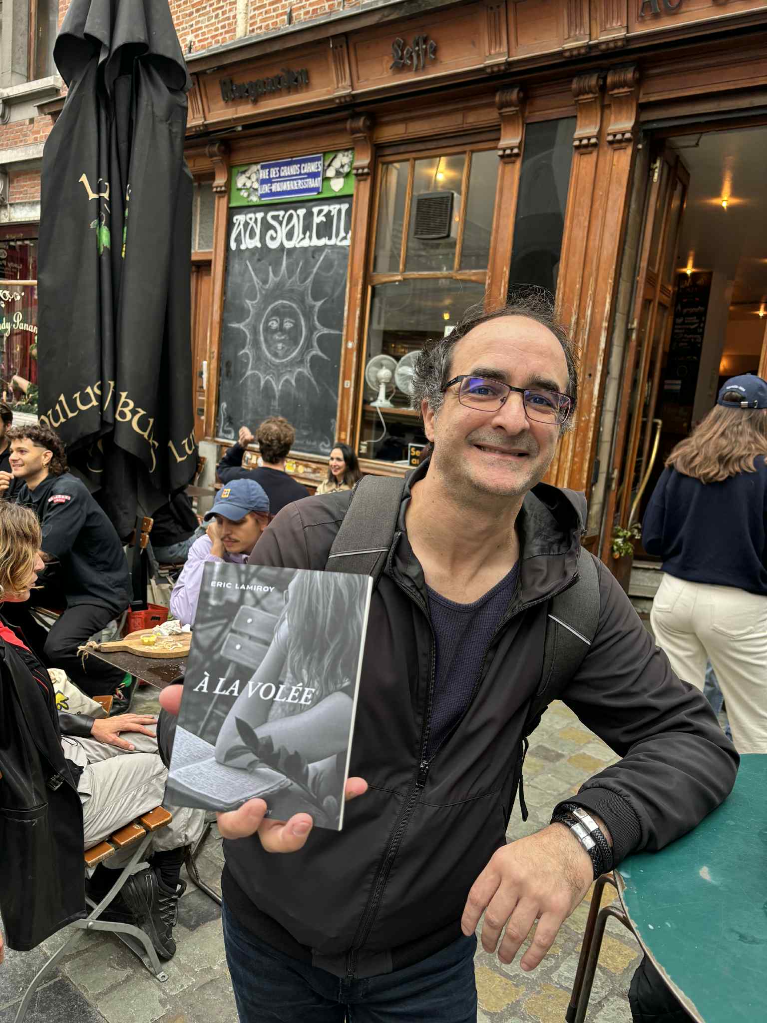 Il part de la vision d’une jeune femme écrivant à une table de bistrot. Il écrit celle qui écrit, puis il écrit simplement là, au présent, ce qu’il voit lui, ce qu’il vit lui. A priori, vu comme ça, rien d’extraordinaire. Mais c’est sans compter la finesse d’Eric Lamiroy qui truffe ses histoires de constats de son cru : notre propension à fréquenter toujours le même restaurant alors qu’il y a en a des milliers d’autres, la difficulté d’expliquer à un nouveau coiffeur ce qu’on veut vraiment sur son crâne, le syndrome du T-shirt noir, le ballet des poseurs de stores et les angoisses existentielles y relatives... On sourit, on rit et on adore. Parce qu’au travers du regard d’Eric, il y a une jouissance de la vie, un curiosité, un humour, un esprit d’analyse un peu déjanté qui rendent joyeux le lecteur.