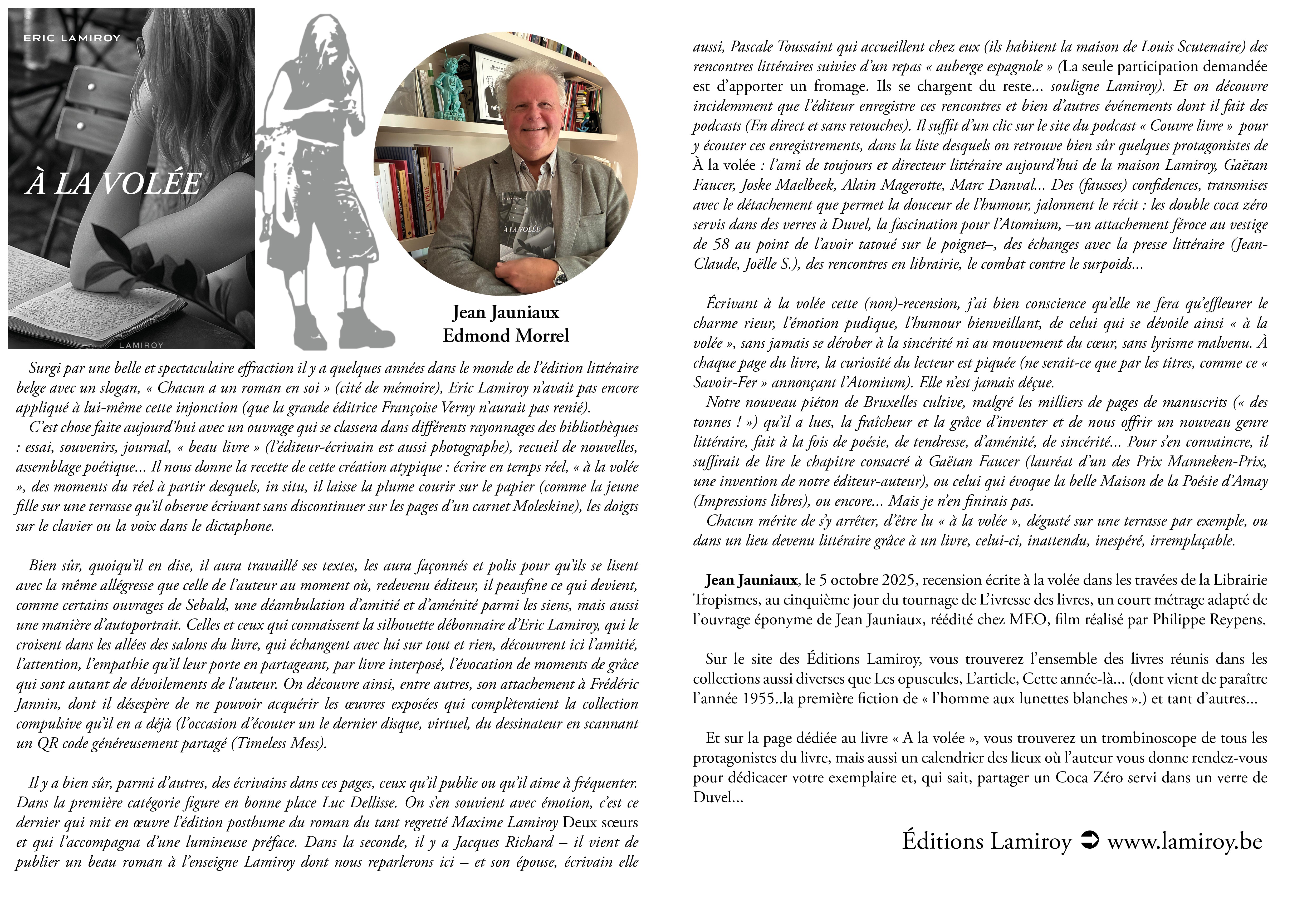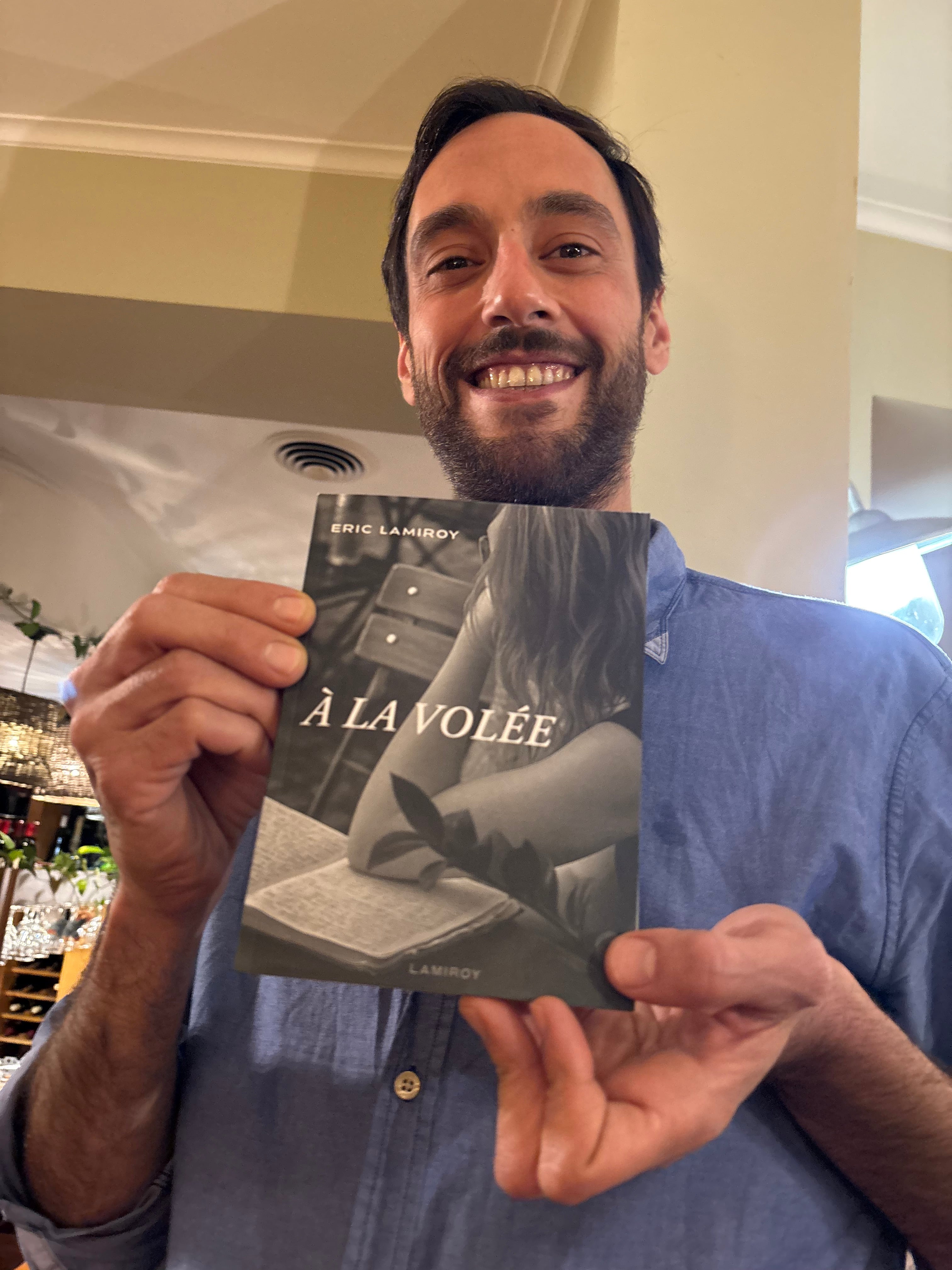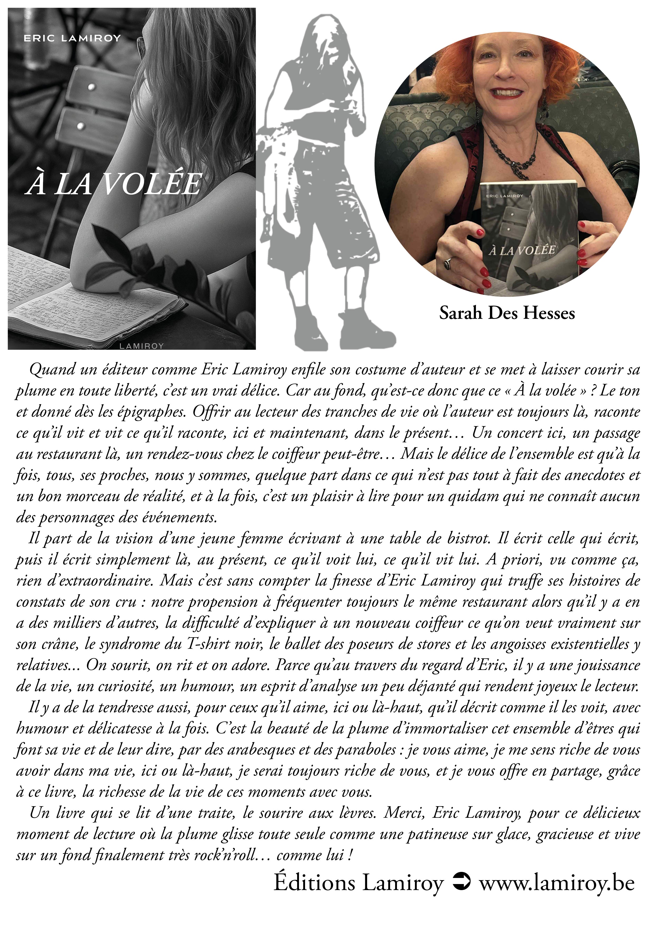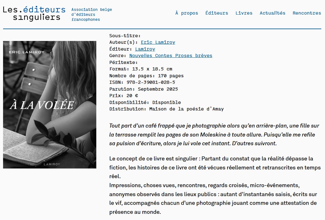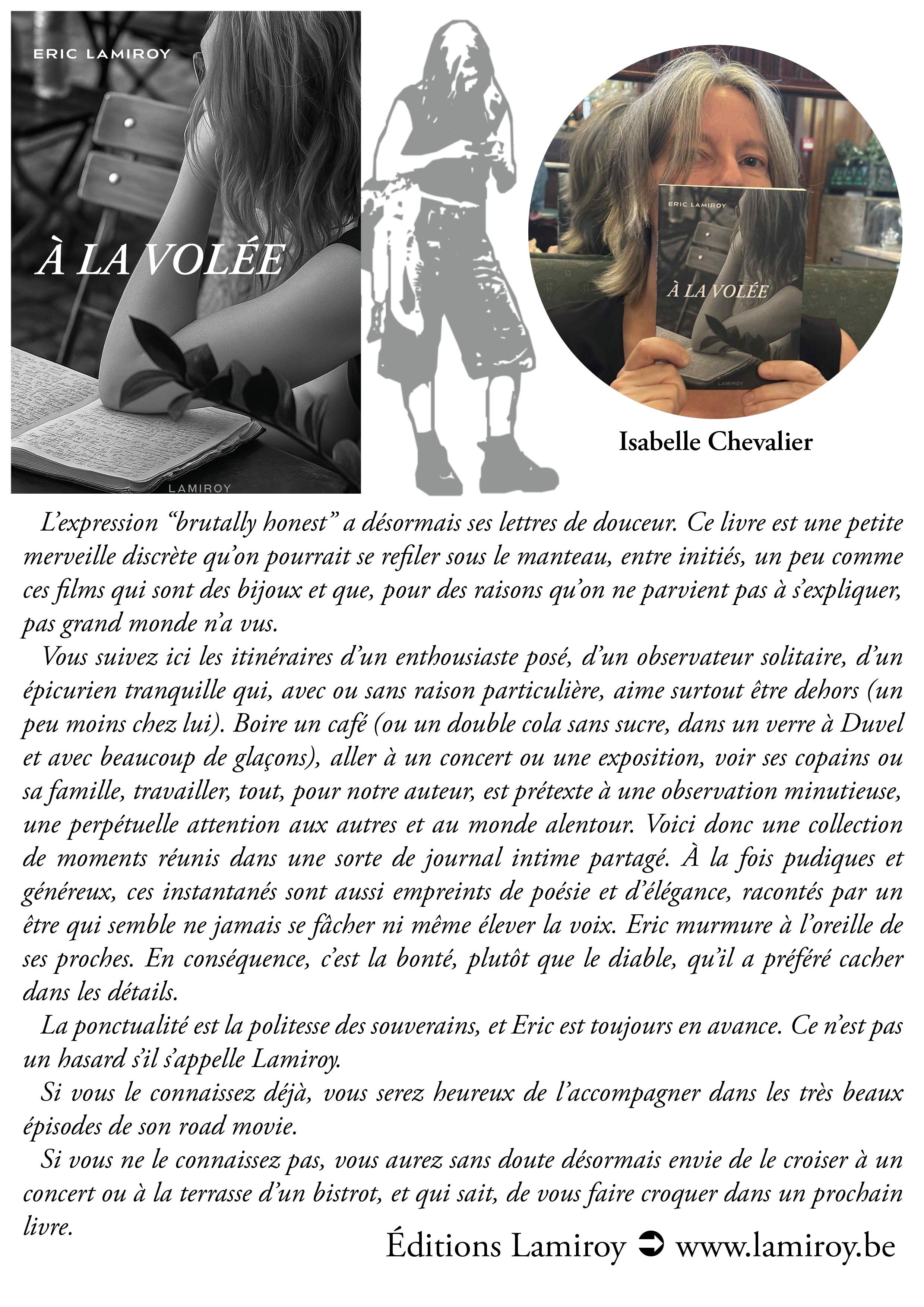 Quand un éditeur comme Eric Lamiroy enfile son costume d’auteur et se met à laisser courir sa plume en toute liberté, c’est un vrai délice. Car au fond, qu’est-ce donc que ce « À la volée » ? Le ton et donné dès les épigraphes. Offrir au lecteur des tranches de vie où l’auteur est toujours là, raconte ce qu’il vit et vit ce qu’il raconte, ici et maintenant, dans le présent… Un concert ici, un passage au restaurant là, un rendez-vous chez le coiffeur peut-être… Mais le délice de l’ensemble est qu’à la fois, tous, ses proches, nous y sommes, quelque part dans ce qui n’est pas tout à fait des anecdotes et un bon morceau de réalité, et à la fois, c’est un plaisir à lire pour un quidam qui ne connaît aucun des personnages des événements.