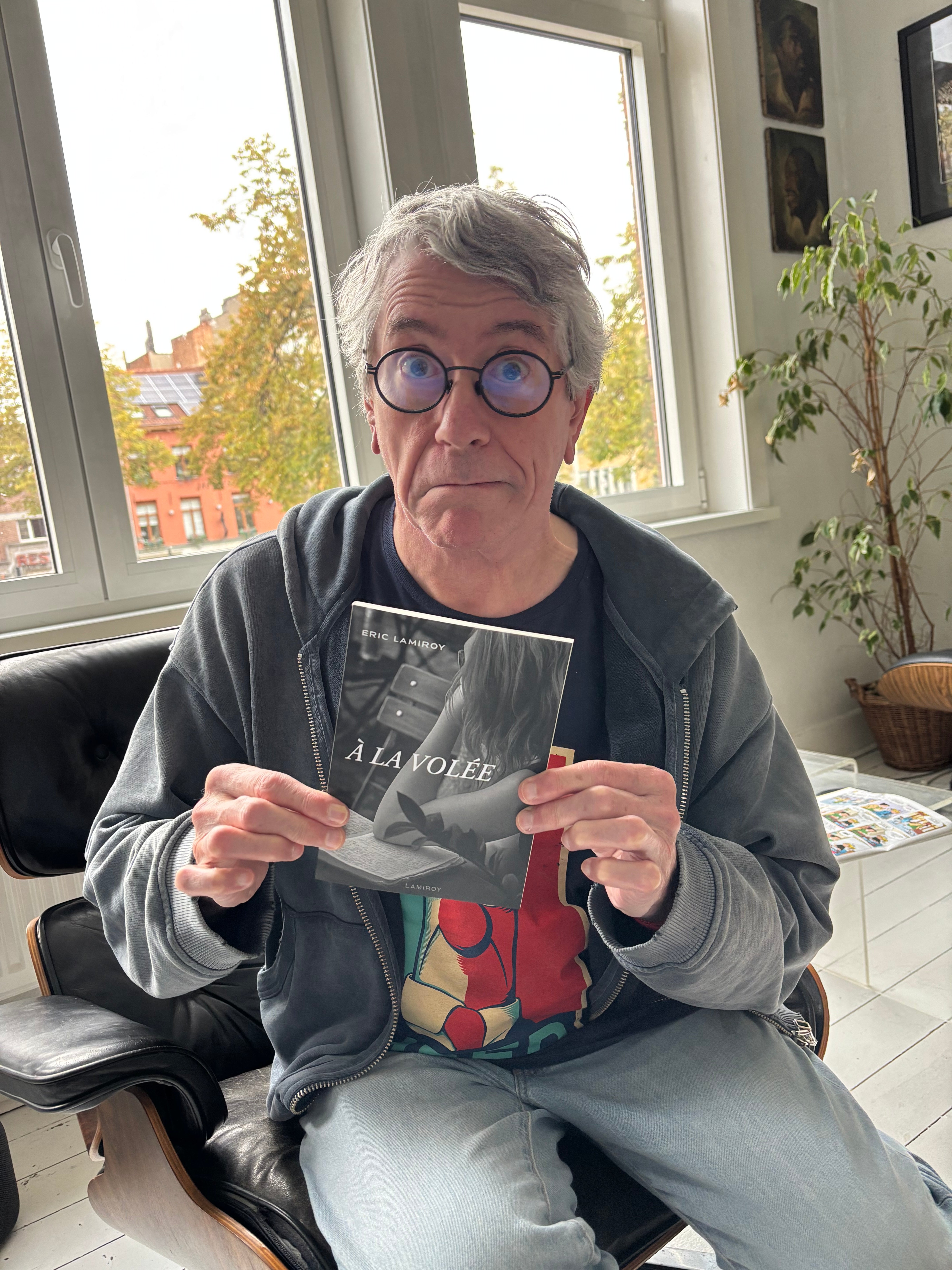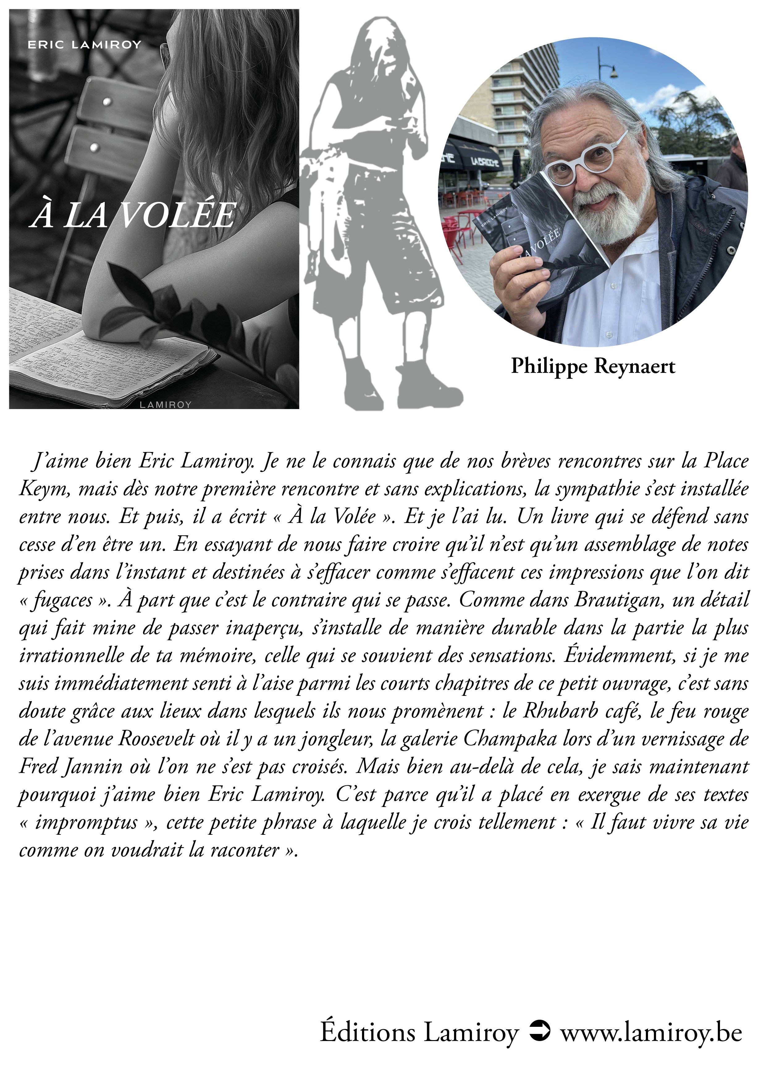 J’aime bien Eric Lamiroy. Je ne le connais que de nos brèves rencontres sur la Place Keym, mais dès notre première rencontre et sans explications, la sympathie s’est installée entre nous. Et puis, il a écrit « A la Volée ». Et je l’ai lu. Un livre qui se défend sans cesse d’en être un. En essayant de nous faire croire qu’il n’est qu’un assemblage de notes prises dans l’instant et destinées à s’effacer comme s’effacent ces impressions que l’on dit « fugaces ». A part que c’est le contraire qui se passe. Comme dans Brautigan, un détail qui fait mine de passer inaperçu, s’installe de manière durable dans la partie la plus irrationnelle de ta mémoire, celle qui se souvient des sensations. Évidemment, si je me suis immédiatement senti à l’aise parmi les courts chapitres de ce petit ouvrage, c’est sans doute grâce aux lieux dans lesquels ils nous promènent : le Rhubarb_café, le feu rouge de l’avenue Roosevelt où il y a un jongleur, la Galerie Champaka lors d’un vernissage de Fred Jannin où l'on ne s'est pas croisés. Mais bien au-delà de cela, je sais maintenant pourquoi j’aime bien Eric Lamiroy. C'est parce qu’il a placé en exergue de ses textes « impromptus », cette petite phrase à laquelle je crois tellement : « Il faut vivre sa vie comme on voudrait la raconter ».