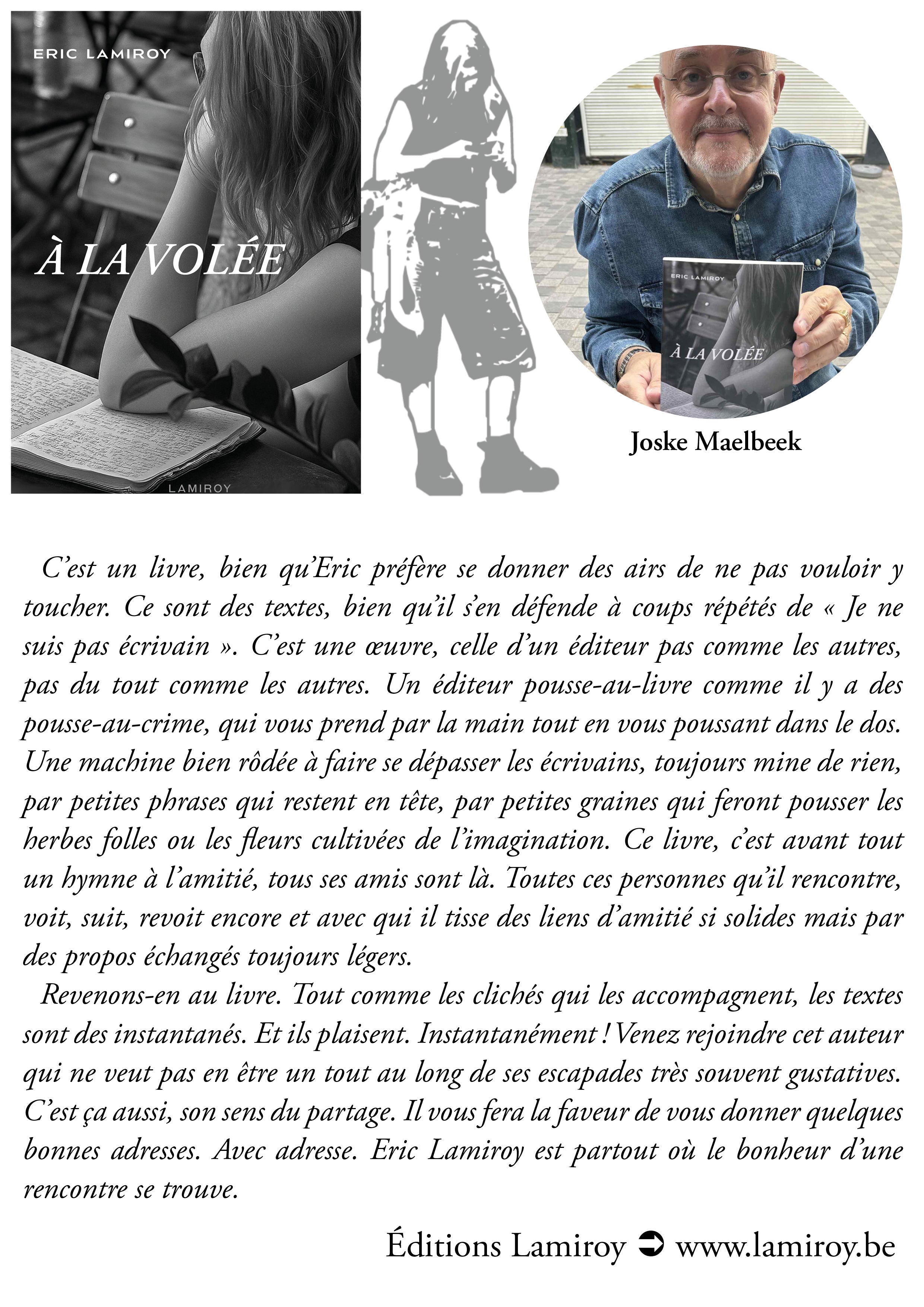 Eric Lamiroy se défend d’être un auteur. Ah bon ? Mettons cela sur le compte de la modestie car l’homme possède indéniablement ce « quelque chose » révélateur d’un véritable talent d’auteur. Pour preuve ; des phrases claires, un juste choix des mots, une structure maîtrisée qui accroche le lecteur, sans oublier ces petites trouvailles qui font la « patte » d’un auteur… un exemple entre mille ?... Clôturant un chapitre consacré à une visite chez le coiffeur, il écrit ceci : « Je sors gonflé à bloc. On m’a recoiffé le moral. » Alors, toi qui me lis ; qu’est-ce que tu dis en bas de ça, comme dirait Joske ?