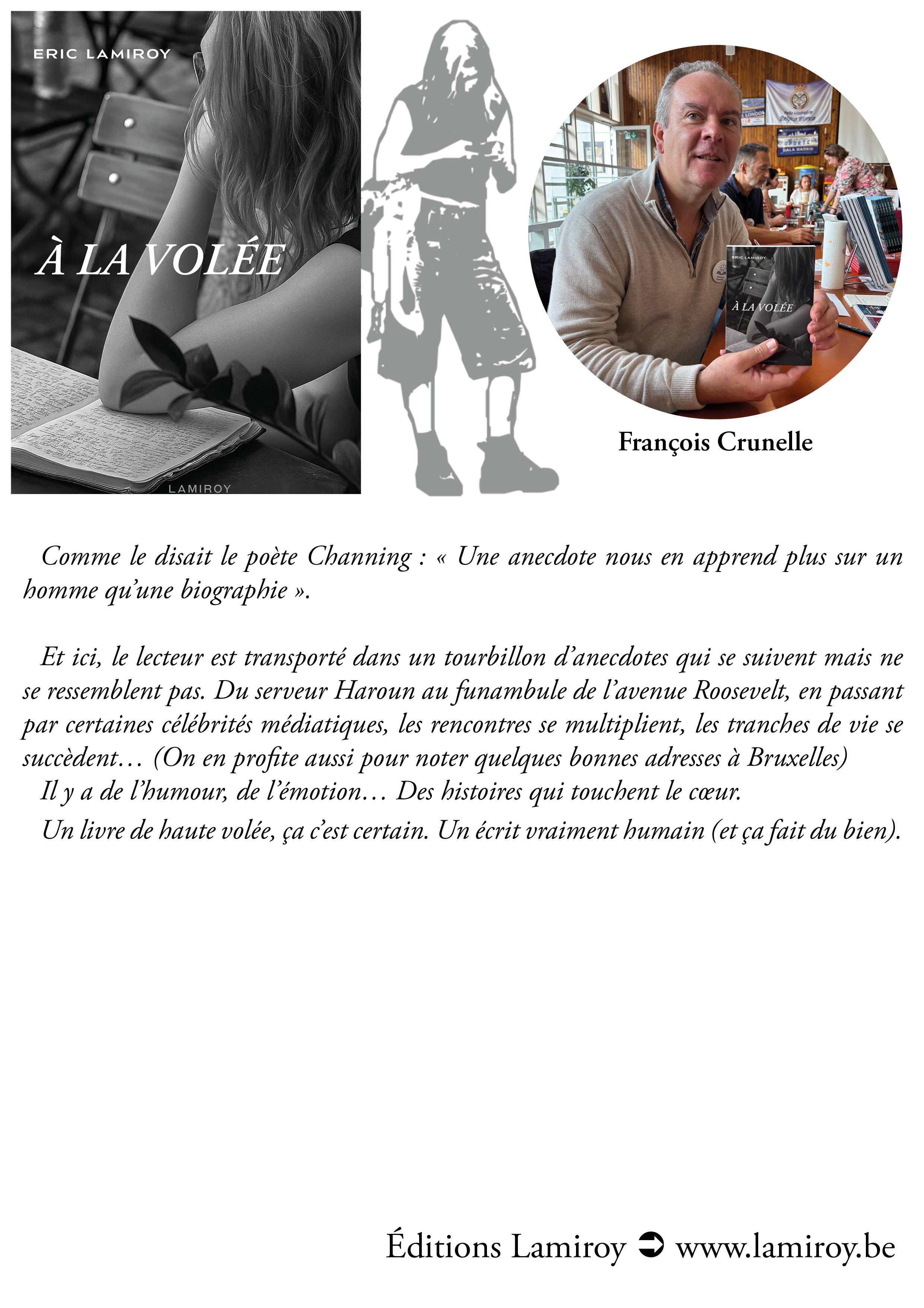 Comme le disait le poète Channing : « Une anecdote nous en apprend plus sur un homme qu'une biographie ». Et ici, le lecteur est transporté dans un tourbillon d’anecdotes qui se suivent mais ne se ressemblent pas. Du serveur Haroun au funambule de l’avenue Roosevelt, en passant par certaines célébrités médiatiques, les rencontres se multiplient, les tranches de vie se succèdent… (On en profite aussi pour noter quelques bonnes adresses à Bruxelles.) Il y a de l’humour, de l’émotion… Des histoires qui touchent le cœur. Un livre de haute volée, ça c’est certain. Un écrit vraiment humain (et ça fait du bien).