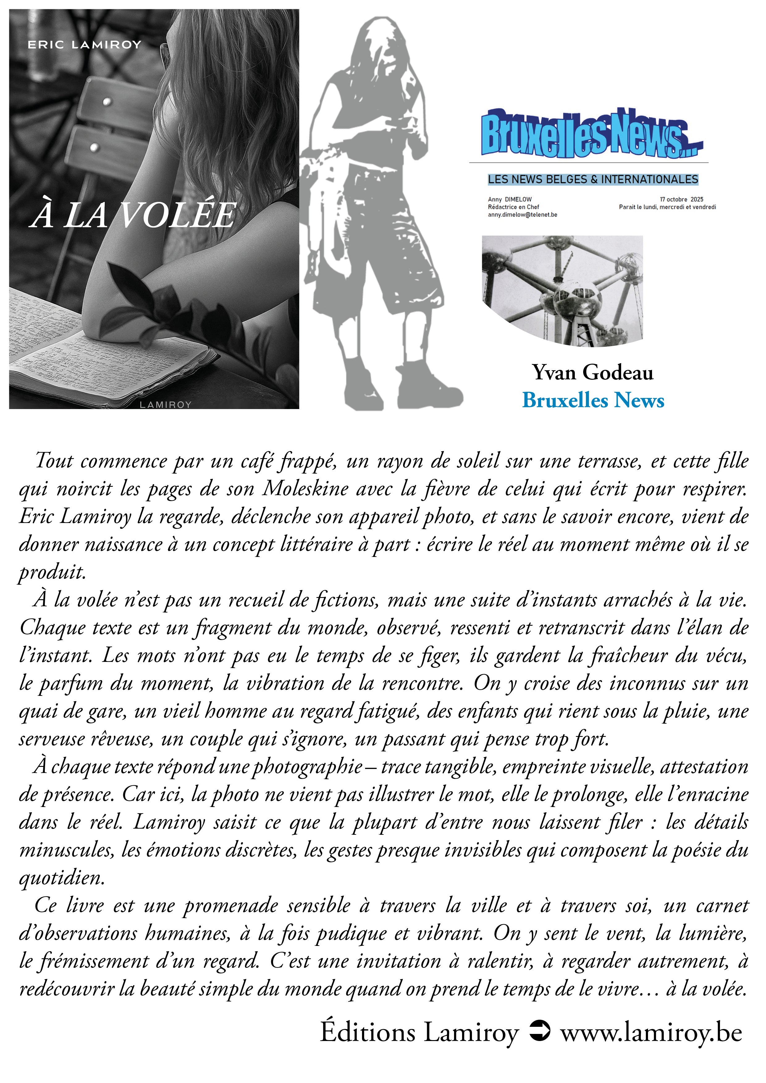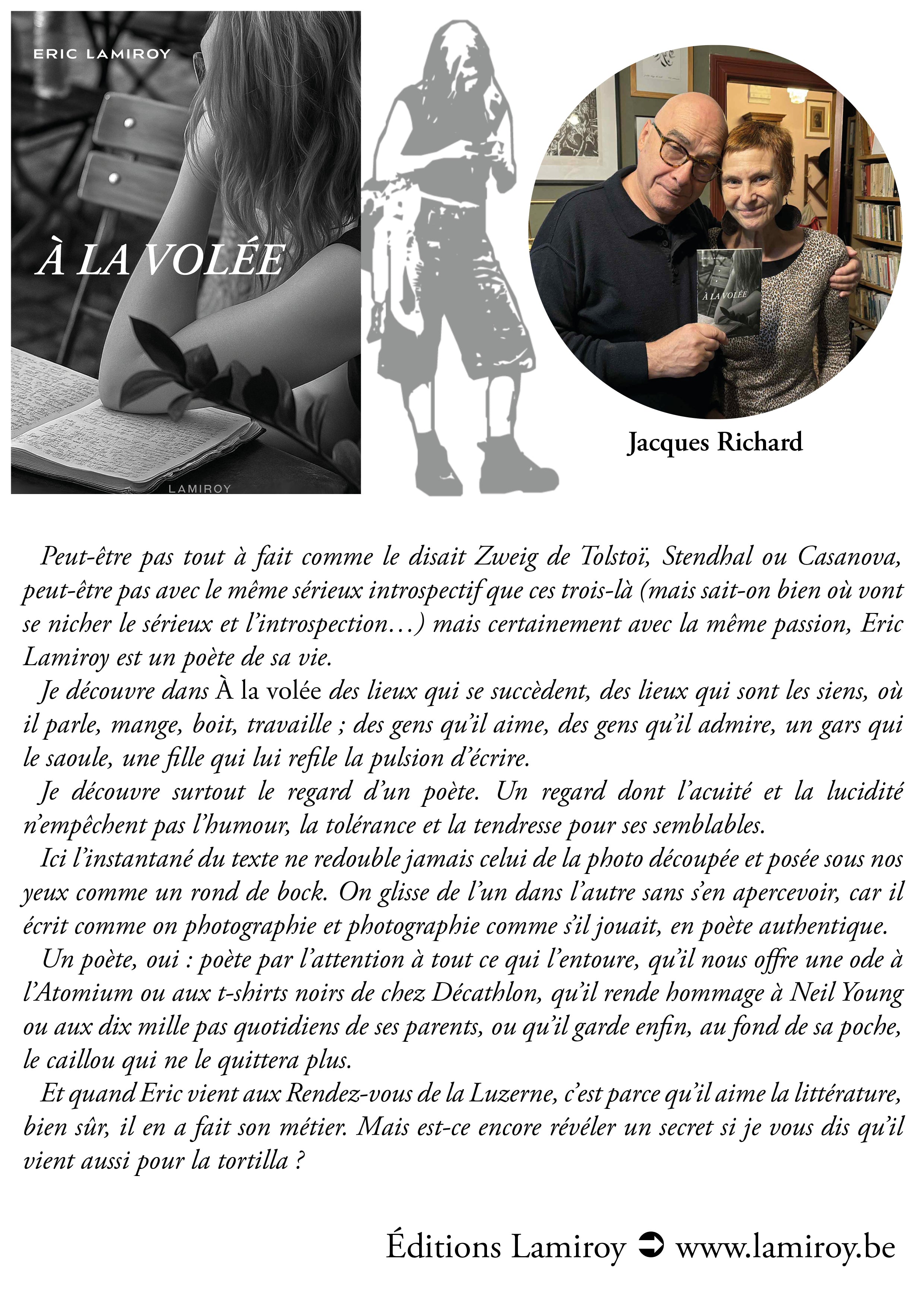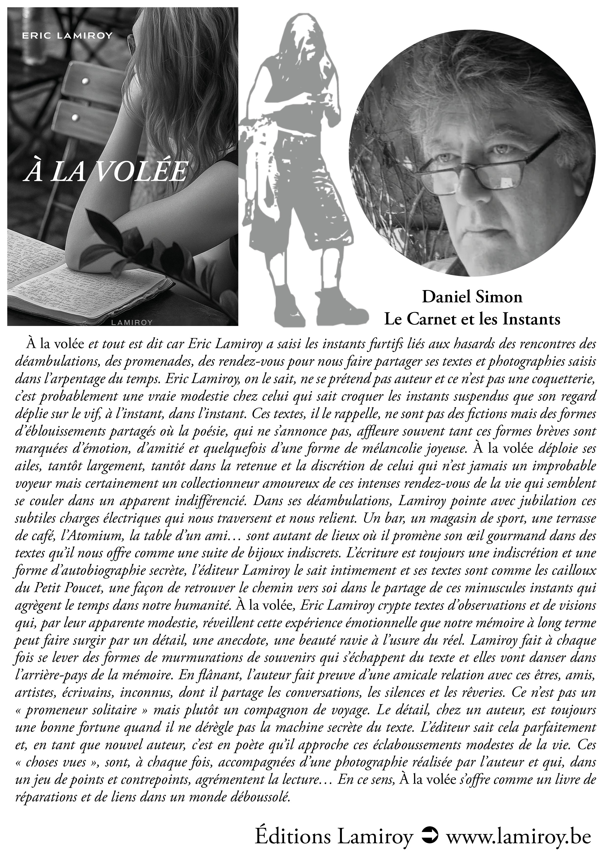À la volée et tout est dit car Eric Lamiroy a saisi les instants furtifs liés aux hasards des rencontres des déambulations, des promenades, des rendez-vous pour nous faire partager ses textes et photographies saisis dans l’arpentage du temps. Eric Lamiroy, on le sait, ne se prétend pas auteur et ce n’est pas une coquetterie, c’est probablement une vraie modestie chez celui qui sait croquer les instants suspendus que son regard déplie sur le vif, à l’instant, dans l’instant. Ces textes, il le rappelle, ne sont pas des fictions mais des formes d’éblouissements partagés où la poésie, qui ne s’annonce pas, affleure souvent tant ces formes brèves sont marquées d’émotion, d’amitié et quelquefois d’une forme de mélancolie joyeuse.